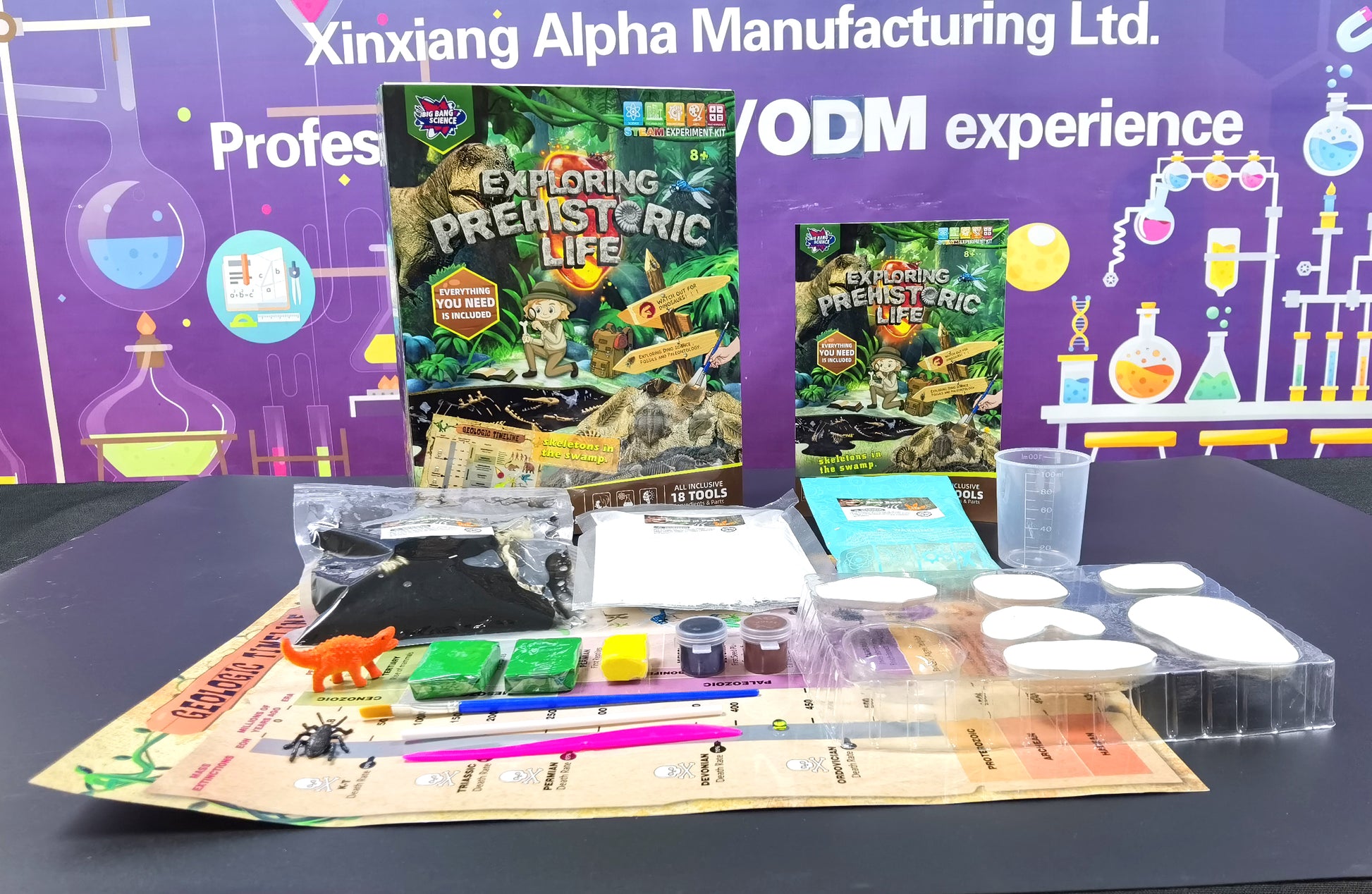 العلبة تتكون من عدة نشاطات تساعد الطفل في أكتشاف الارض ما قبل الانسان في عصور الديناصورات وكيفية عمل الديناصورات وحفر الهياكل العظمية.