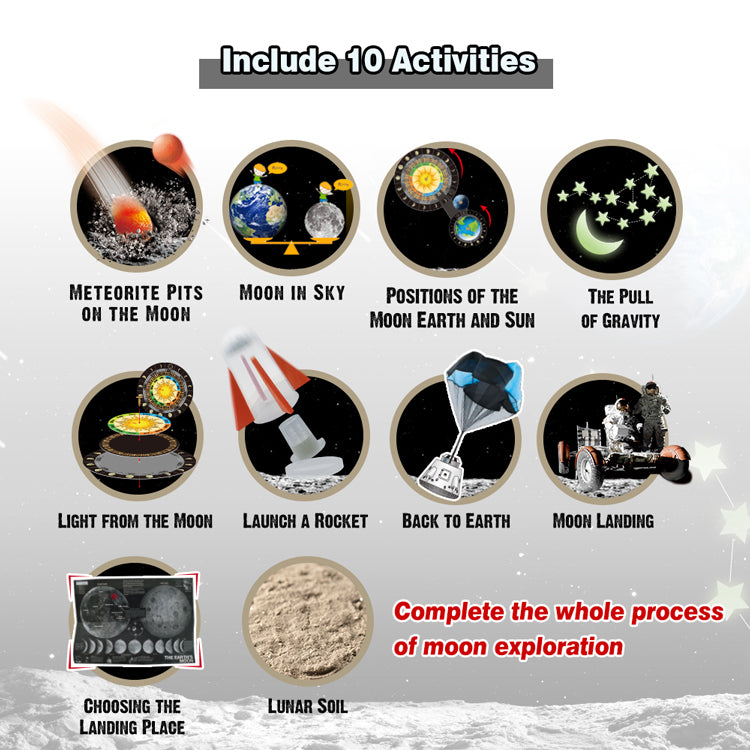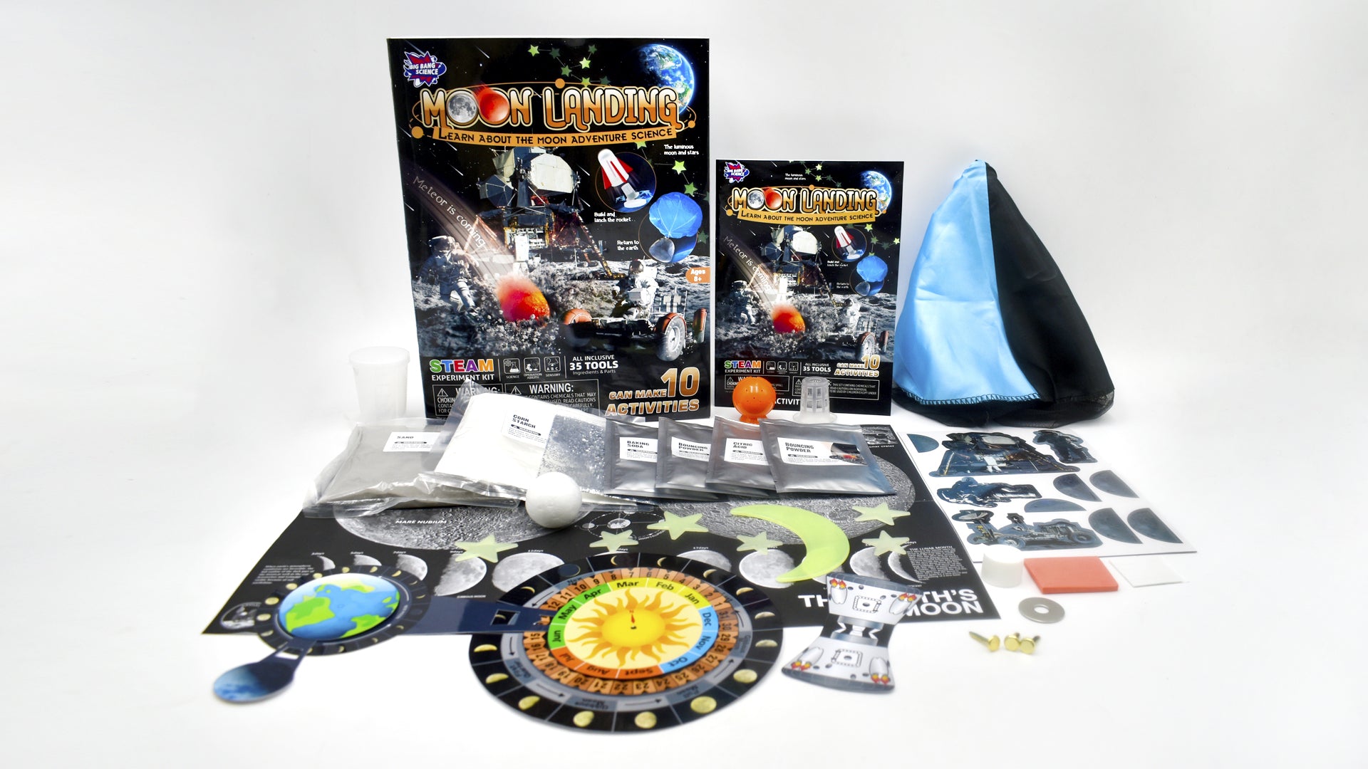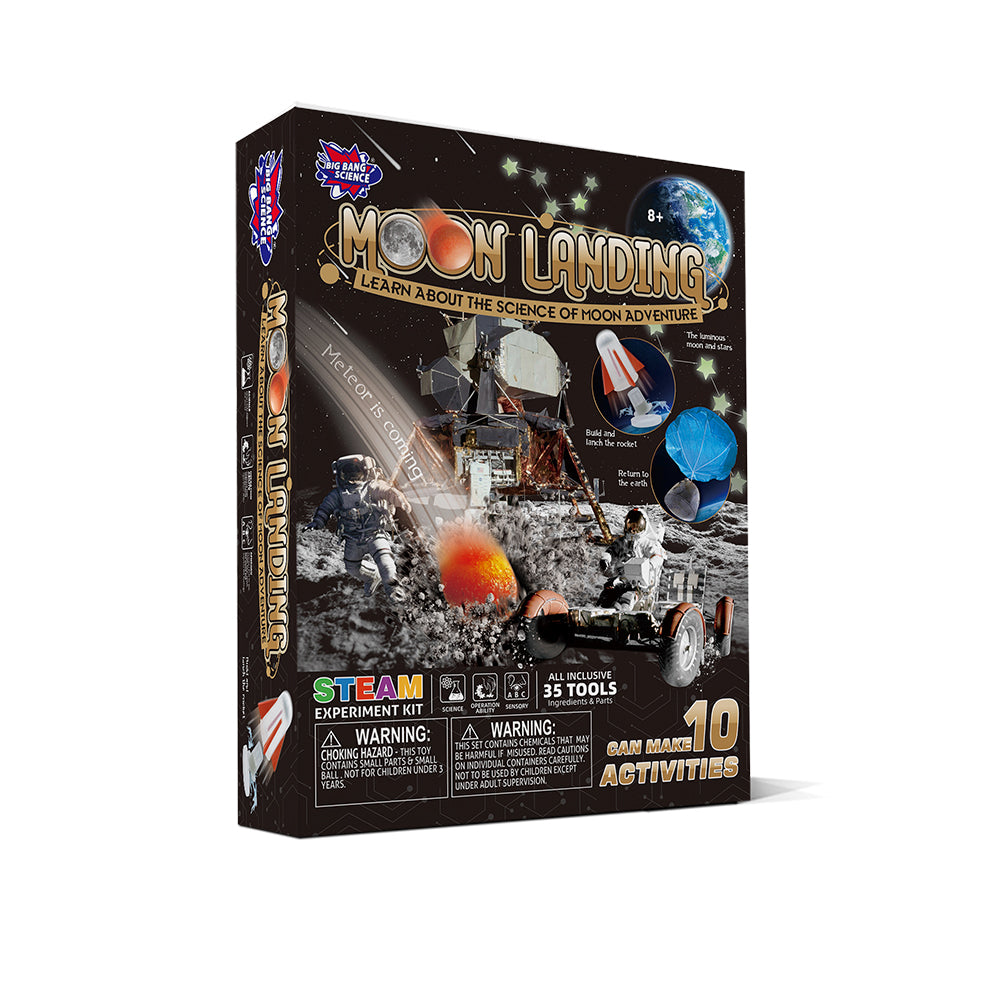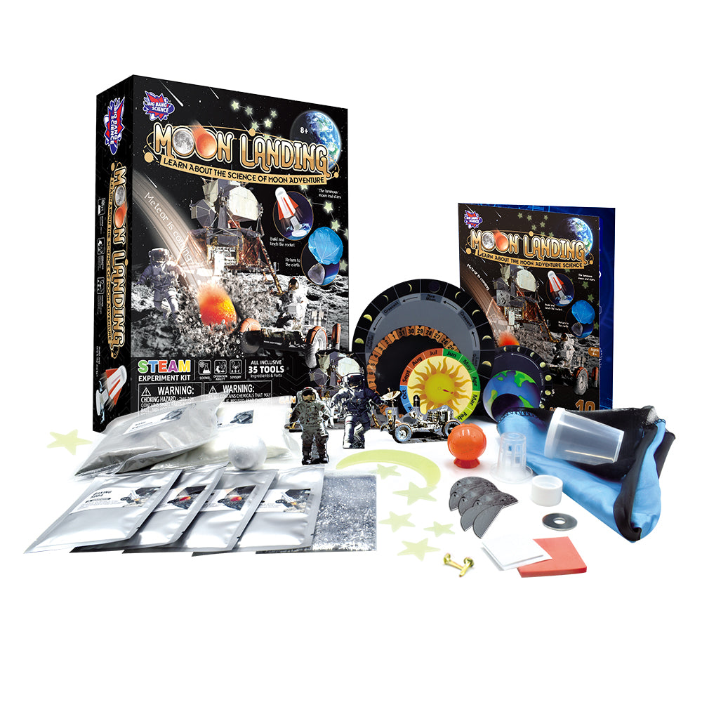 العلبة تتكون من تعليم الطفل عن رحلة الذهاب الى القمر والنزول والرجوع الى الأرض وعن النظام الشمسي
